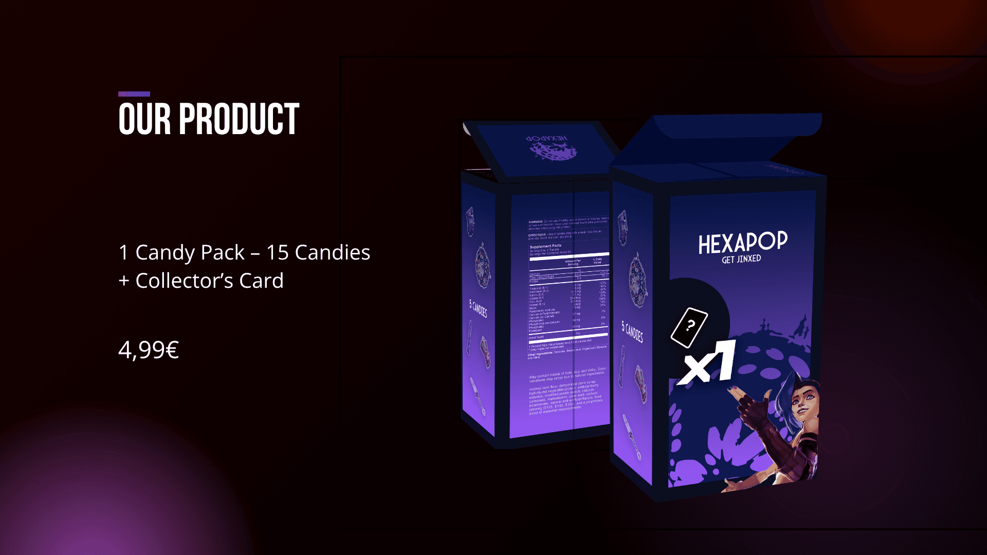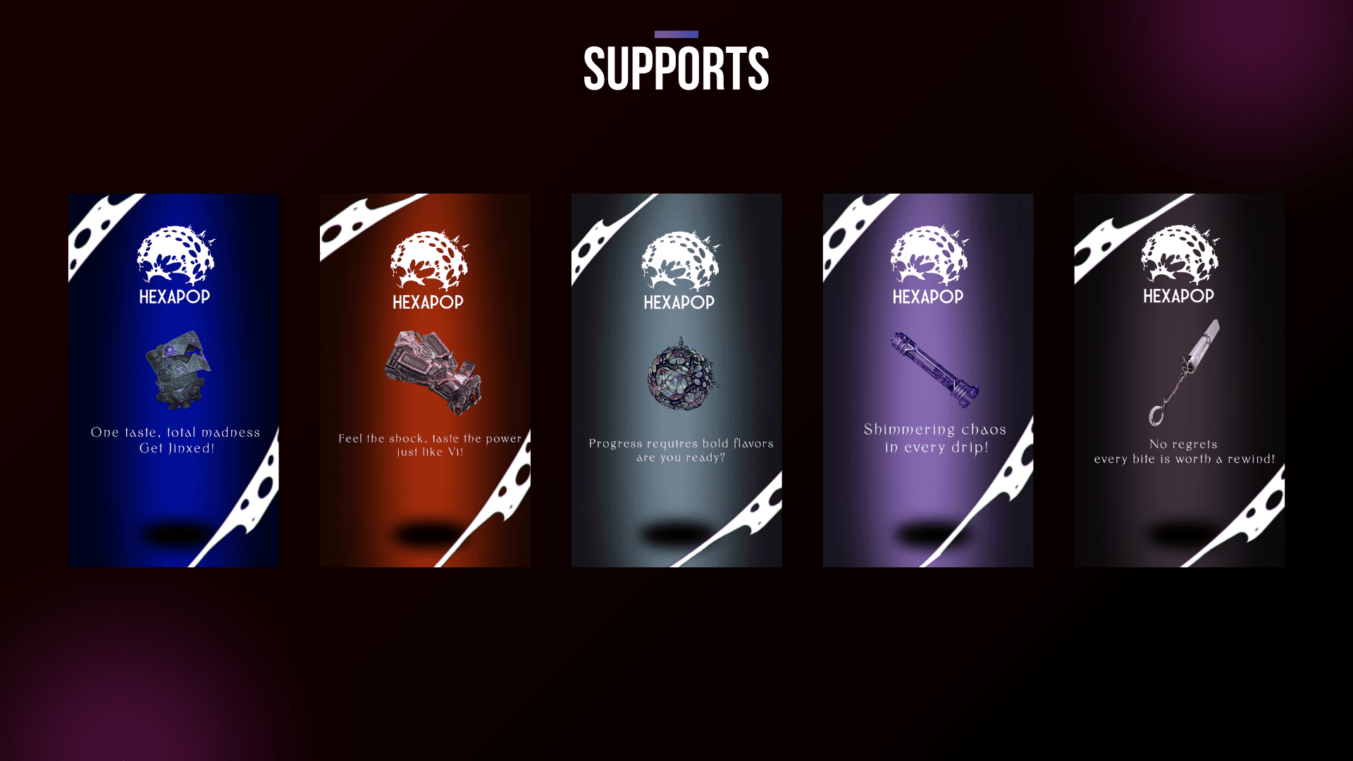 HexaPop est un concept de marque de confiserie inspiré de la série Arcane et de l’univers de League of Legends. Chaque bonbon est associé à un personnage emblématique et propose une expérience sensorielle unique, en lien direct avec sa personnalité.